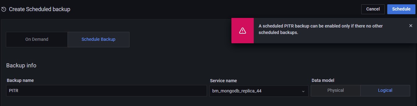 在创建PITR备份之前,请确保禁用任何其他计划备份任务。当其他计划备份任务处于活动状态时,尝试启用PITR, PMM将显示错误消息: