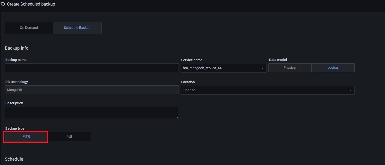 要开始保存oplog, PBM需要一个备份快照。这些快照是在PMM中激活PITR计划任务时创建的。