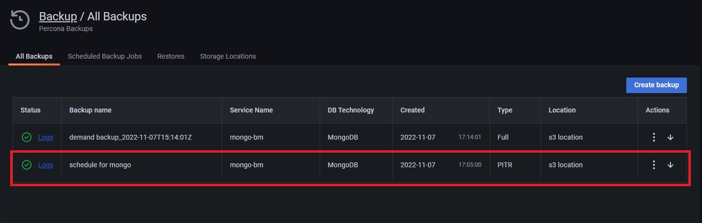 PITR oplog在您的PITR作业第一次运行后几分钟(默认为10分钟)可用。要查看相应的PITR工件,请查看下面的列表Backup >所有备份.