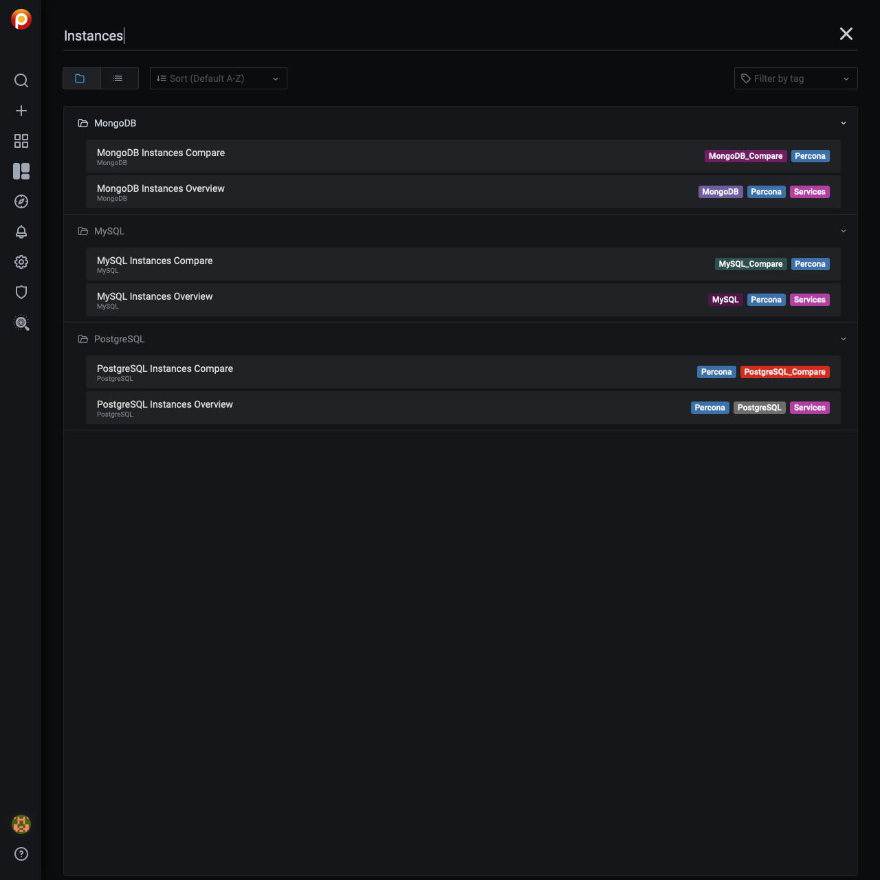 - 点击按名称搜索仪表板然后开始输入仪表板名称的任意部分(在本例中,“实例”)。