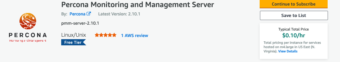 假设您有一个AWS(亚马逊网络服务)帐户,请定位雷竞技下载官网Praybet雷竞技竞猜在线官网ercona监控和管理服务器在AWS市场或使用这个链接.
