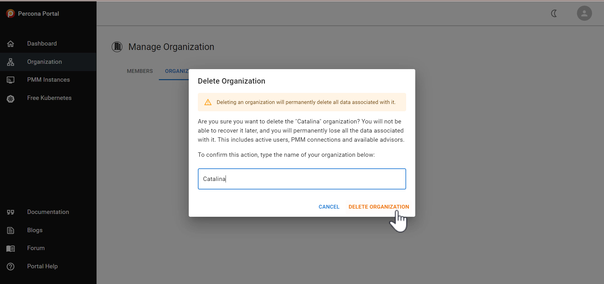 作为Admin用户,您可以删除组织及其所有数据。组织用户仍然可以使用他们的帐户访问Percona平台,并加入或创建其他组织。雷竞技下载官网